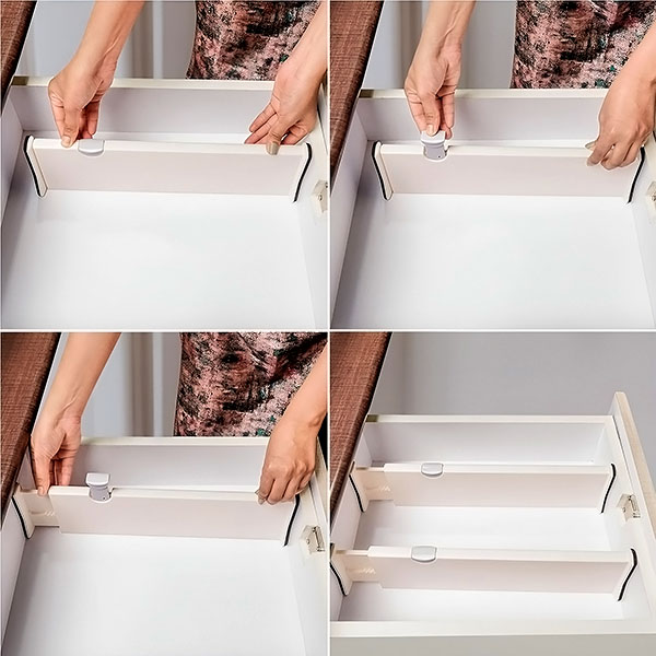 Trasformerete i vostri cassetti disordinati in pochi secondi. Con una semplice installazione “move and click”, organizzare non è mai stato così facile. Basta posizionare, regolare e bloccare il divisorio, senza bisogno di attrezzi o colla.