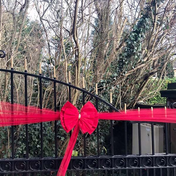 Infilare il nastro nelle fessure della porta, incrociarlo, fare un fiocco e fissarlo con le spille.