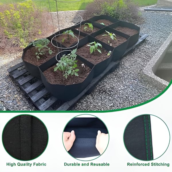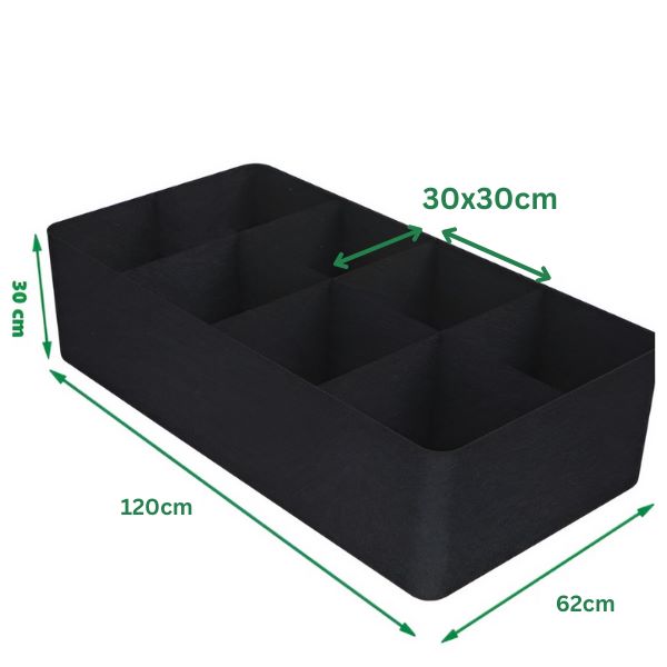 Questo letto da giardino rialzato in tessuto ha un design a 8 griglie, con dimensioni di 120 x 62 cm e un’altezza di 30 cm.